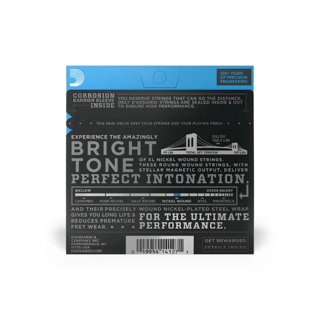 XL Nickel Wound, D'Addario's most popular electric guitar strings, are precision wound with nickel-plated steel onto a carefully drawn, hexagonally shaped, high carbon steel core. The result is strings with long lasting, distinctive bright tone and excellent intonation, ideal for the widest variety of guitars and musical styles.